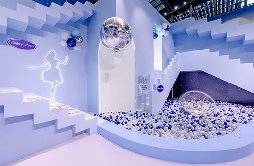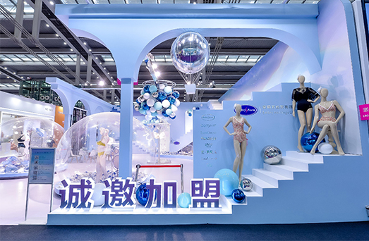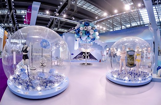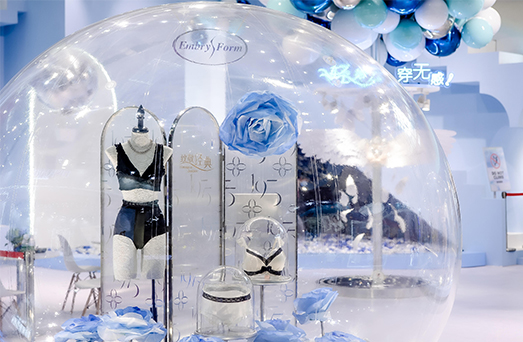 在安莉芳展位,天空之蓝与漂浮的梦幻交织交汇,一切都是轻盈且自由的存在,上可登空,踩到绵软的云朵,下可随热气球,去体验自由的感受。在这片没有约束的理想国度里,经过专利工艺和精巧剪裁的内衣作品亭亭玉立。当女性之美不再被标签定义,当女性能够自由呈现舒适与优雅,一切都变得简单起来,一切又那么地绚丽多姿。