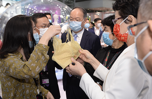 中国纺织工业联合会党委书记高勇,中国纺织工业联合会、中国贸促会纺织行业分会副会长徐迎新,中国针织工业协会会长林云峰,深圳市工业和信息化局一级调研员郑璇,深圳市内衣行业协会会长胡志滨,深圳市内衣行业常务副会长兼秘书长张峰伟一行人,在安莉芳控股有限公司执行董事鹿群女士的陪同下参观了安莉芳展馆,并对安莉芳的专利技术轻柔杯2.0产生了浓厚兴趣与充分肯定。
